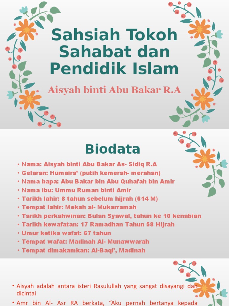 Pada 572 masehi di mekah, berasal dari keturunan bani taim, suku quraisy. Beliau pada awalnya digelar abdul kaabah (hamba kaabah) tetapi selepas pengislamannya, beliau menukar namanya kepada abdullah. Biodata sayidina abu bakar al siddiq ra. Wanita pertama syahid, meninggal sebelum hijrah. Abu bakar assidiq ialah salah satu sahabat rasulullah yang namanya telah terdengar secara umum di telinga setiap umat muslim karena sering disebut dan diceritakan sebagai seorang yang baik akhlaknya dan besar perjuangannya dalam menyertai rasulullah dalam menegakan islam dan.
